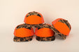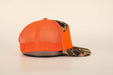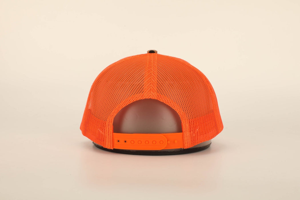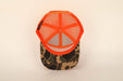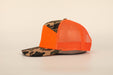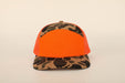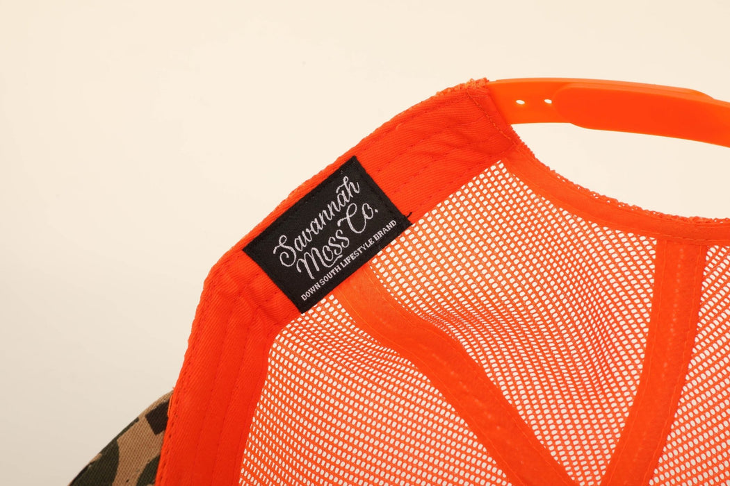 Savannah Moss Co Blaze Orange/Duck Camo 7 panel leather patch trucker hat