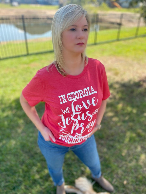 Savannah Moss Company$20.00| /Enjoy watching football in this “In Georgia We love Jesus and Pray for Touchdowns” Red Graphic Tee. Perfect with just blue jeans and a cool breeze....