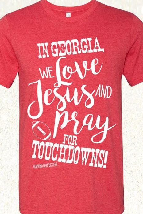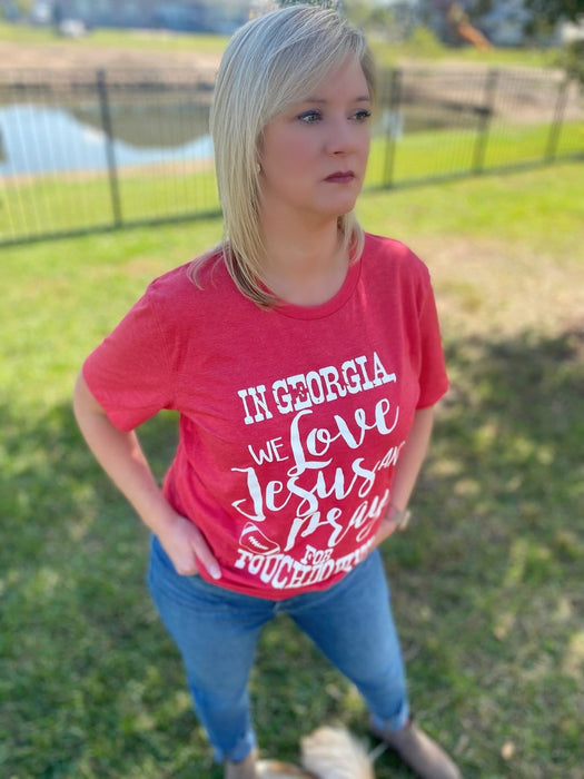 Enjoy watching football in this “In Georgia We love Jesus and Pray for Touchdowns” Red Graphic Tee. Perfect with just blue jeans and a cool breeze. Enjoy the Georgia Saturday Nights. Get em before football season ends!