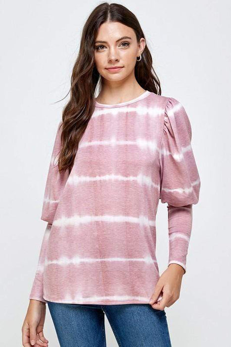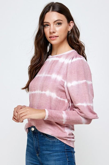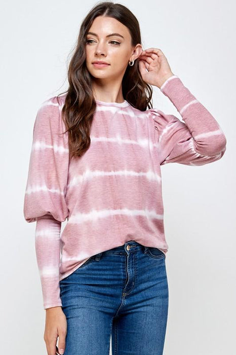 LADIES' MAUVE TIE DYE STRIPE ROUND NECK BUBBLE LONG SLEEVE TOP