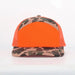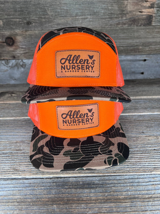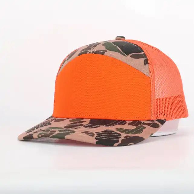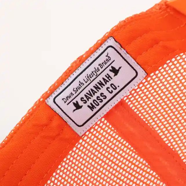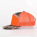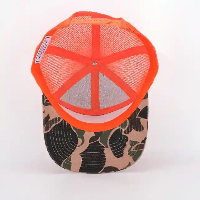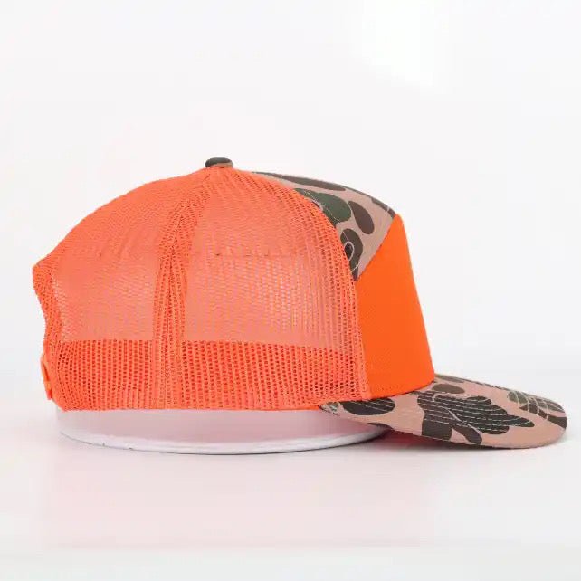 Savannah Moss Co Blaze Orange/Duck Camo 7 panel leather patch trucker hat